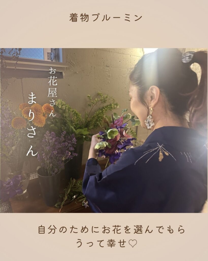普段、お花って自分のためには選ばない、ましてや、撮影のためにって。そして、困っていたら、その日の着物コーディネートを見て、まりさんが選んでくれます。